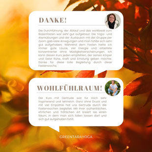 Dank der intensiven Begleitung von Gertrude war die Woche für mich kein Problem. Neben 3 KG leichter fühlte ich mich wesentlich wohler und ausgeglichener. Meine Allergie ist weniger, meine Fingerschmerzen weg.